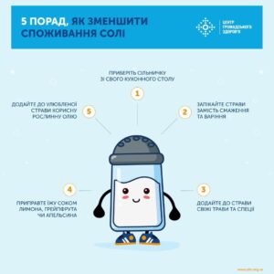 Ще раз наголошуємо, уникнути або полегшити перебіг ряду захворювань можна простим обмеженням – ВООЗ рекомендує вживати не більше 5 грамів (1 чайна ложка) солі на добу (з урахуванням солі, яка міститься у всіх спожитих продуктах харчування).
